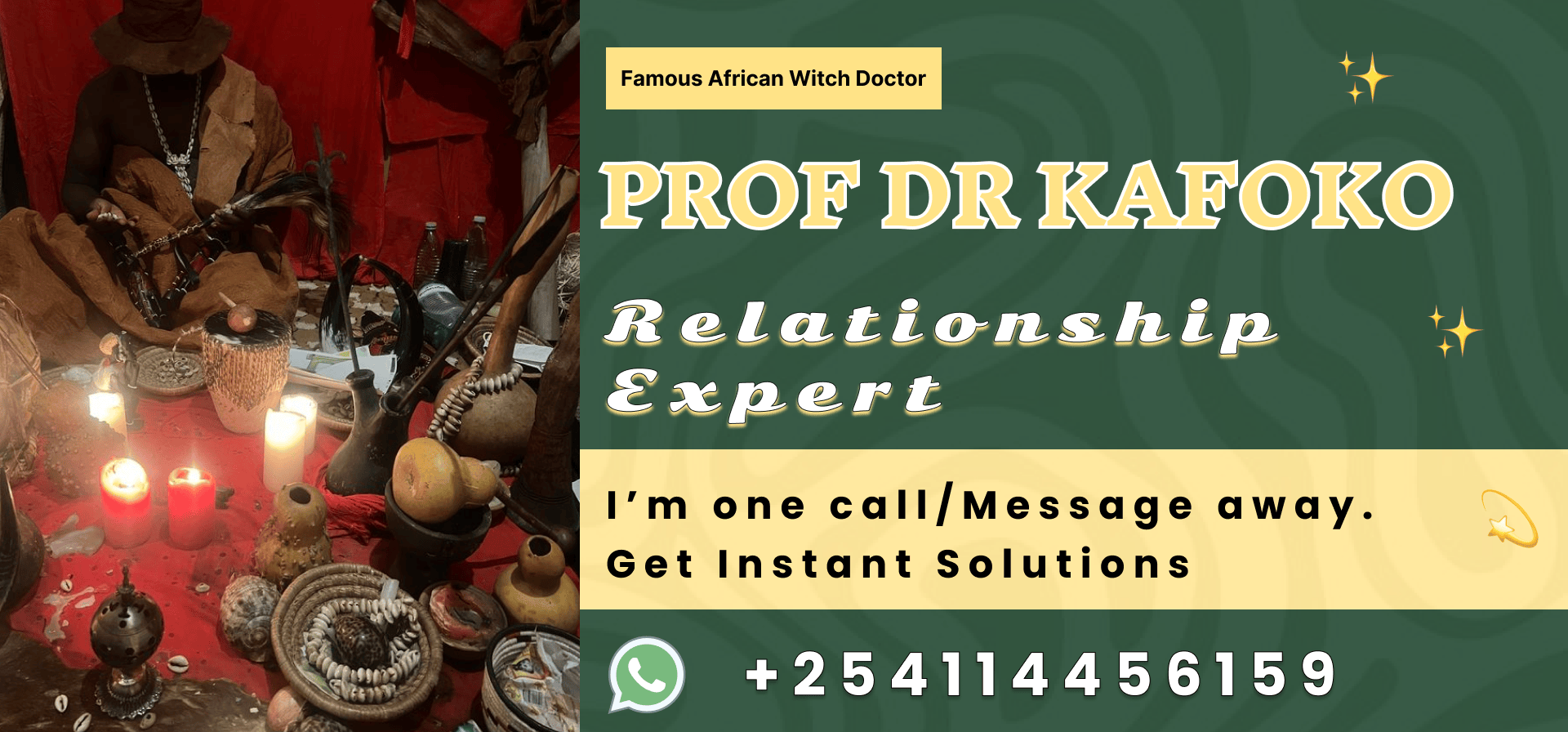Prof. Dr. Kafoko is one of the most respected and powerful African witch doctors, known across Africa, the UK, USA, and the Middle East for solving complex life problems using authentic ancestral rituals and deep spiritual wisdom. With decades of experience in traditional African healing, he has helped thousands overcome challenges in love life, business struggles, marriage delays, financial hardship, court cases, family conflicts, and more.